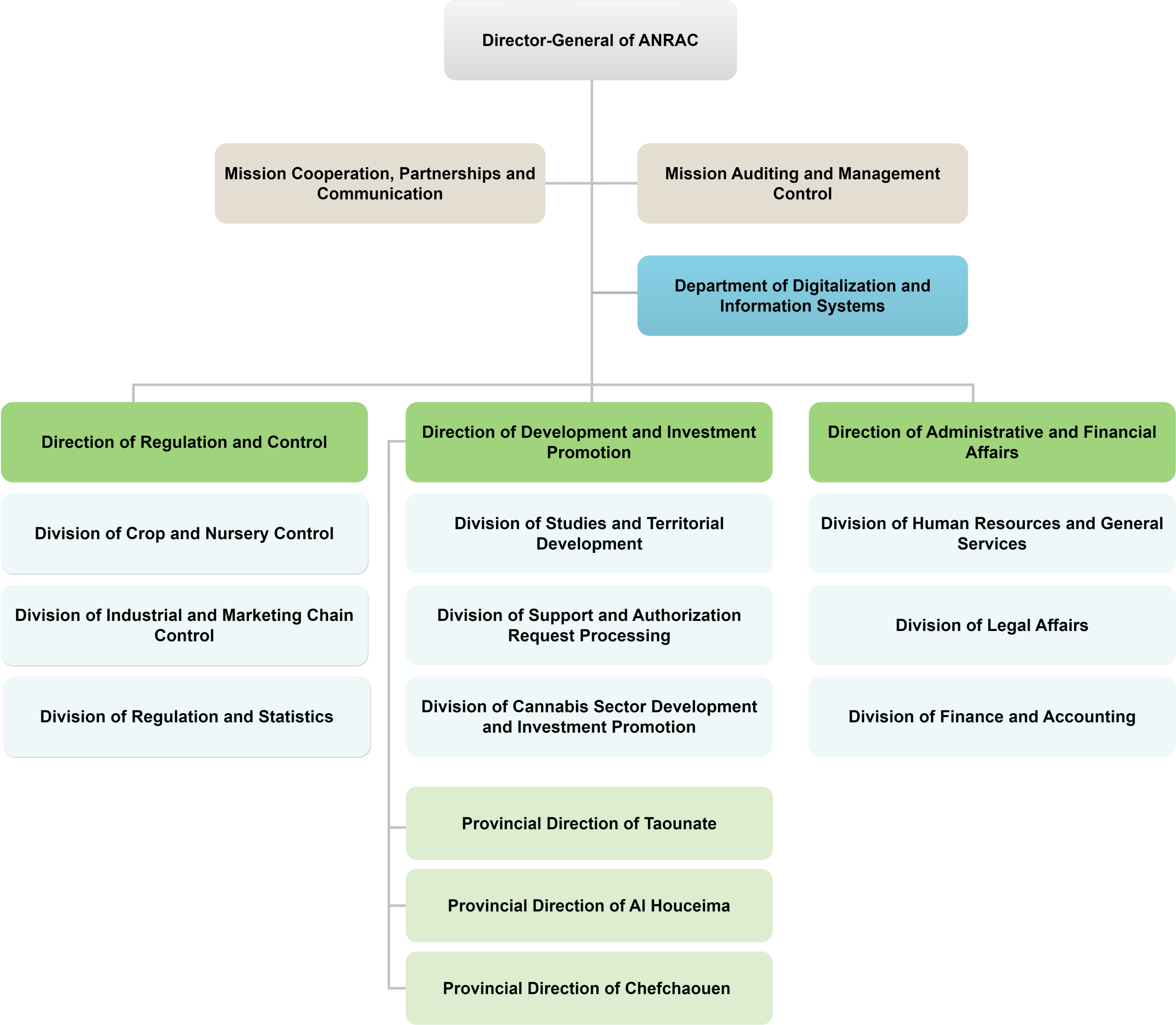 Home Organization of ANRAC The organizational chart of the National Agency for the Regulation of Cannabis-Related Activities is presented below : Detailed Organizational Chart of ANRAC